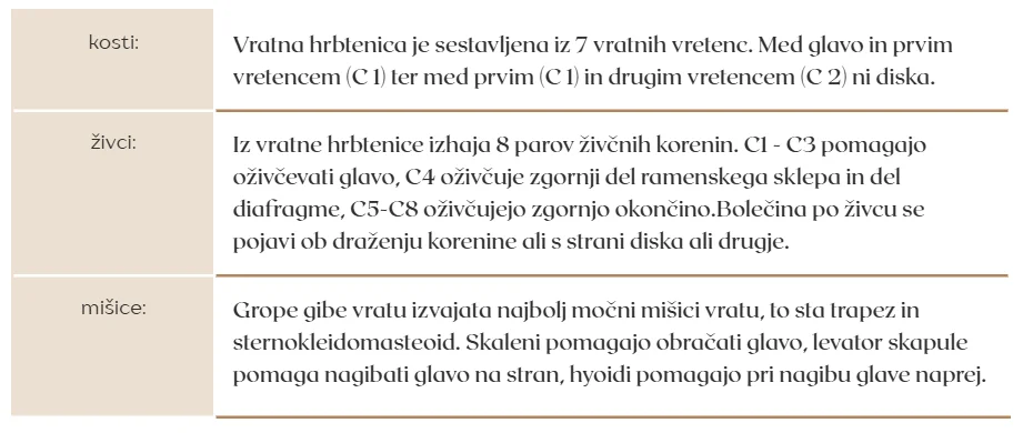 Vzrokov za bolečino v vratu je veliko. Navadno ni samo en vzrok, ampak je kombinacija večih, ki v različni meri vplivajo na razvoj težav. Razdelimo jih lahko na: