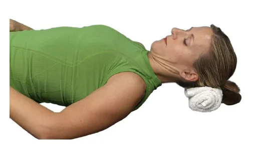 Lezite na hrbet, zvita brisača je pod spodnjim delom glave. Počasi potisnite glavo v brisačo in približajte brado proti prsnemu košu, dokler ne začutite raztega. Zadržite 3 sekunde. Ponovite 10x.