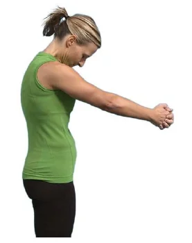 Stojte in prekrižajte dlani iztegnjenih rok pred telesom. Počasi upognite zgornji del trupa, odmaknite lopatici in brado približate prsnemu košu, dokler ne začutite udobnega raztega. Razteg zadržite 20 sekund, ponovite 3x.
