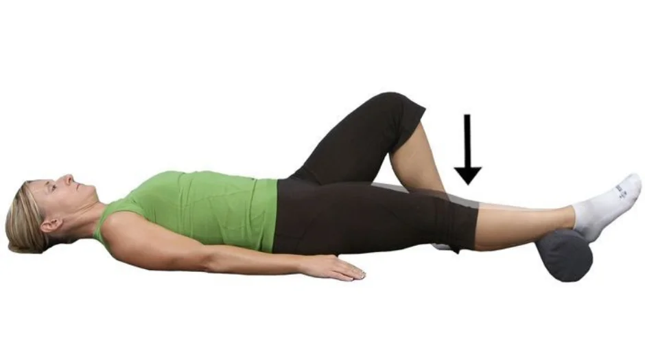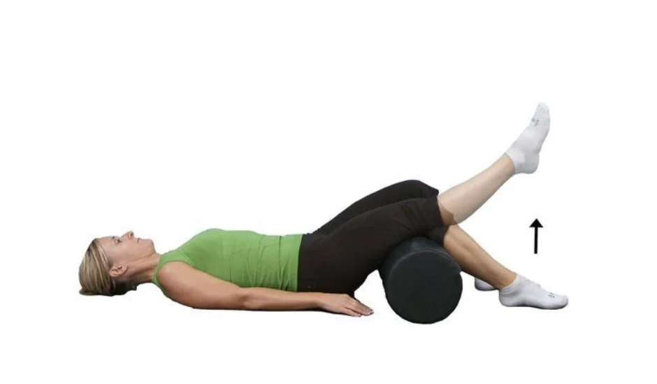 Lezite na hrbet, noge so pokrčene, pod koleni je valjček. Koleni sta naslonjeni na oporo (valjček ali podoben predmet). Iztegnite eno nogo tako, da napnete sprednje stegenske mišice. Zadnji del noge naj ves čas izvajanja vaje ostane v stiku z oporo. Vajo ponovite 20x.