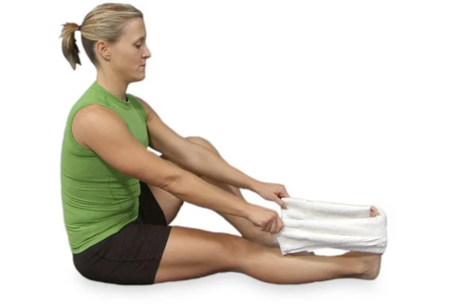 Sedite na podlago. Ena noga je iztegnjena na podlagi, druga pa pokrčena v kolenskem sklepu in s stopalom oprta na tla. Okoli iztegnjene noge ovijte brisačo, konca pa držite v iztegnjenih rokah. Z brisačo potegnite nogo proti trebuhu, dokler ne začutite udobnega raztega. Držite zadnji del stegna in meča v stiku s podlago. Razteg zadržite 10sekund, ponovite 5x.