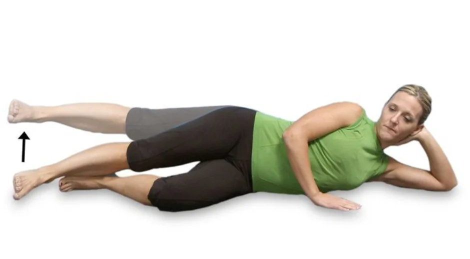 Ležite na bok, glava je podprta s pokrčeno roko. Spodnja noga je rahlo pokrčena v kolenskem in kolčnem sklepu ter v stiku s podlago, zgornja pa iztegnjena in rahlo dvignjena od tal. Aktivirajte globoke mišice trupa ter kolčne mišice in dvignite iztegnjeno nogo proti stropu za približno 20cm. Pazite, da pri vračanju v začetni položaj noga ostaja rahlo privzdignjena. Vajo ponovite 20x.