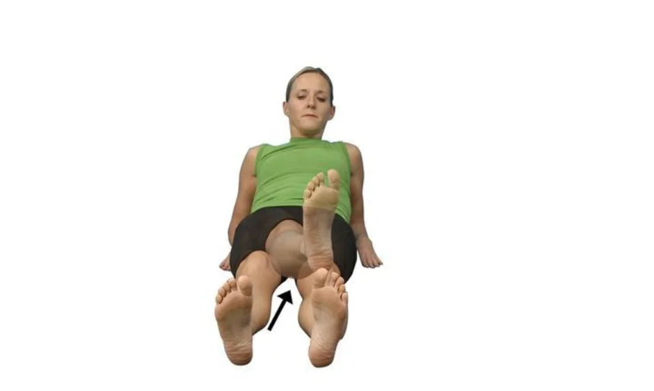 Sedite z iztegnjeno nogo in s sproščenimi stegenskimi mišicami. S palcem roke pritiskajte na pogačico iz zunanje strani. Zadržite 5 sekund. Ponovite iz druge strani. Ponovite 10x.