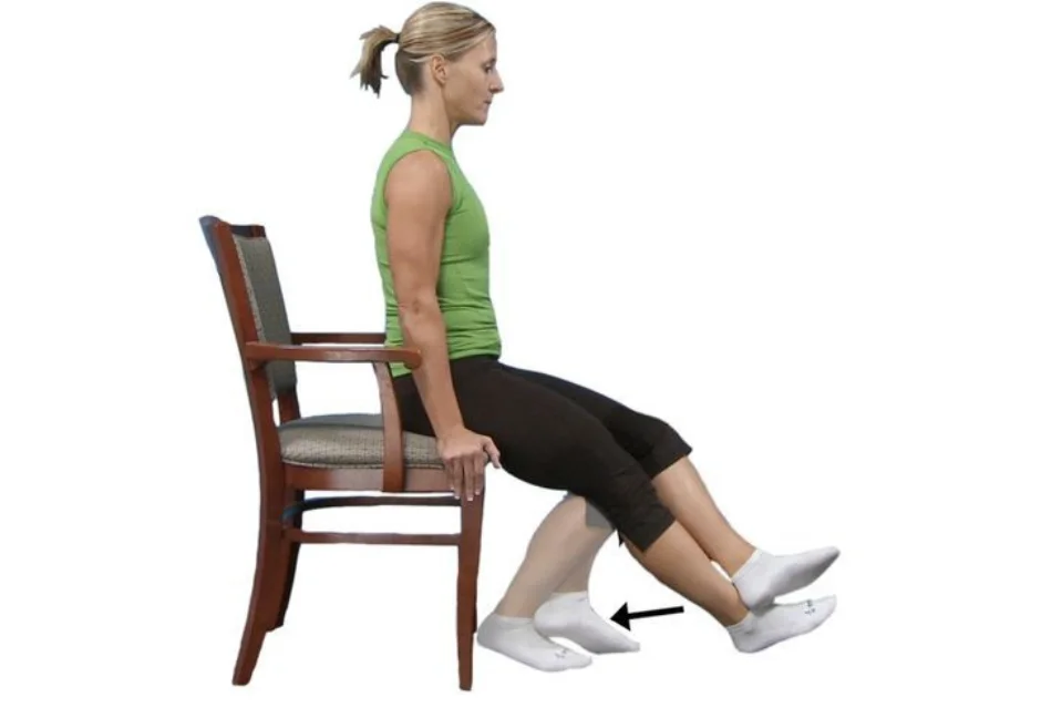 Sedite na rob stola, stopala so v stiku s podlago. Drsite s stopalom ene noge po podlagi najprej v smeri naprej (izteg kolena), nato pa v smeri nazaj proti stolu (upogib kolena). Pazite, da je med izvajanjem vaje trup poravnan. Vajo ponovite 20x.