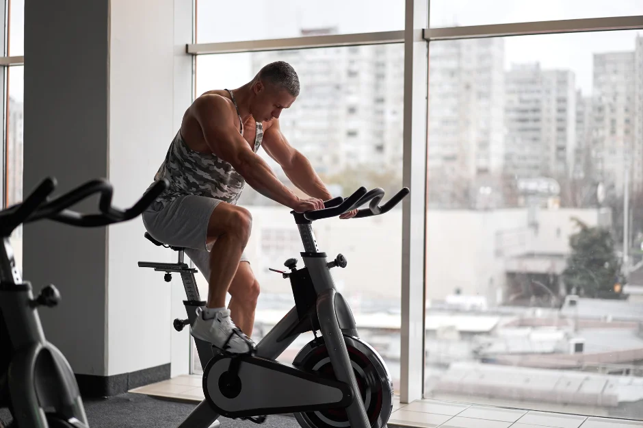 Ko lahko koleno pokrčite preko pravega kota pričnite kolesariti na sobnem kolesu.
