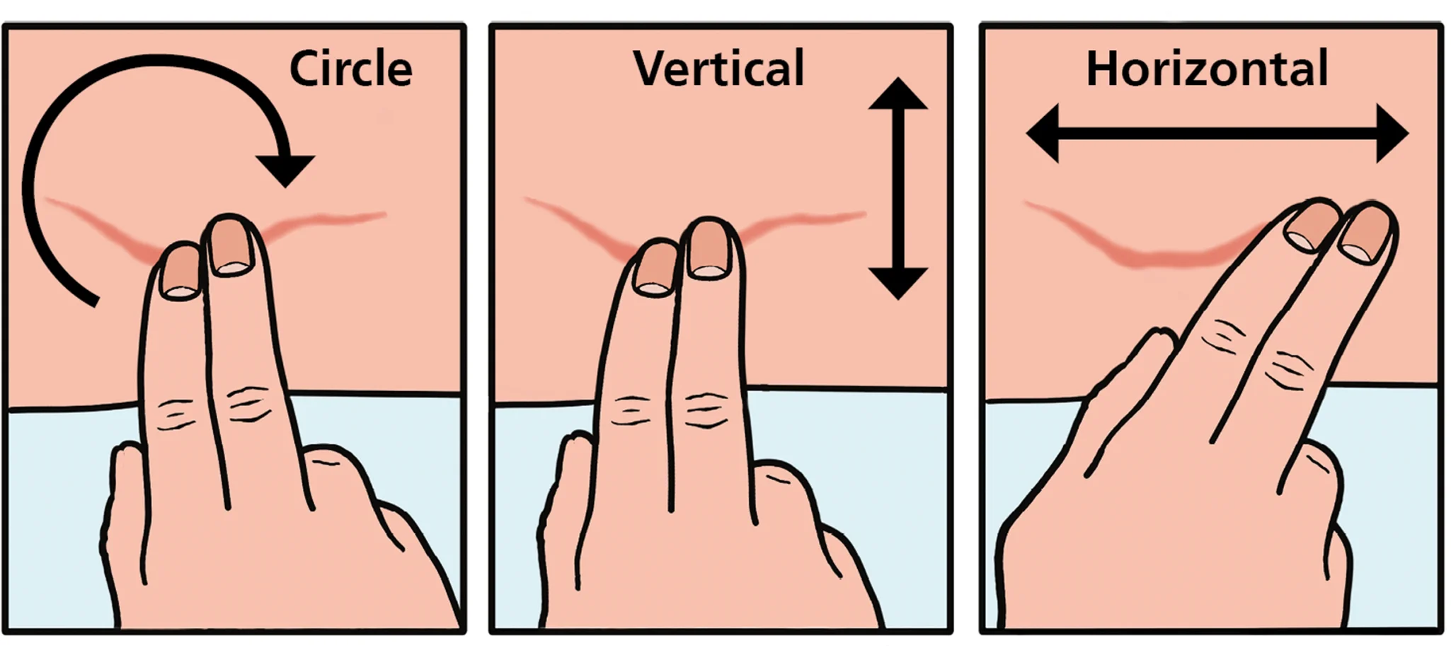 Z enim (ali dvema) prstoma se prilepite na začetek brazgotine in nežno pritisnete. Sedaj počasi potujte v eno smer in nato drugo, sedaj pojdite še navzgor in nato navzdol. Za konec še naredite nekaj krožnih gibov. Pomaknite se za širino prsta navzdol po brazgotini in ponovite. Postopek ponavljate toliko časa, da pokrijete celo brazgotino.